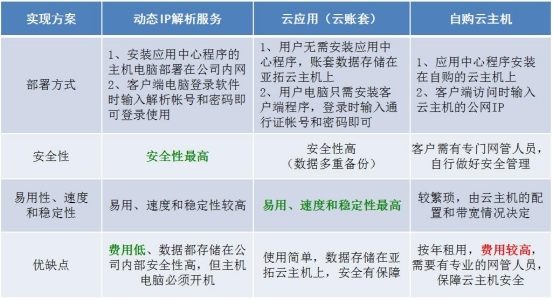 動態IP解析服務、云應用(云賬套)、自購云主機這三種方式都可以實現通過互聯網遠程使用信管飛軟件,三種方案的部署方式、安全性、易用性及優缺點對比如下圖所示: