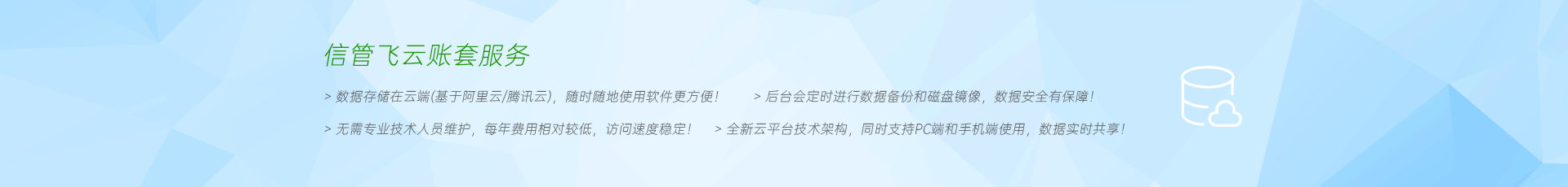 云賬套服務是亞拓軟件開發的云端數據存儲方案。客戶賬套存儲在我們的信管飛云主機上,客戶電腦只需要安裝客戶端程序,輸入云賬套服務的通行證帳號和密碼即可登錄軟件。 客戶使用云賬套服務,數據存儲在我們的云主機上,隨時隨地都可以使用,也支持手機端App應用。我們云主機后臺會定時進行數據備份和磁盤鏡像,保證數據的安全可靠使用。