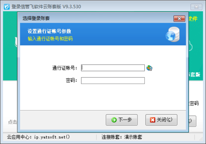步驟二:登錄窗口,點“選擇賬套”按鈕,輸入通行證賬號和密碼,點“下一步”選擇賬套,然后輸入操作員和密碼即可登錄。
