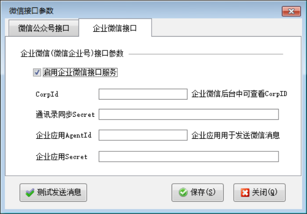 在功能導(dǎo)航窗選擇“擴展應(yīng)用”—》“微信參數(shù)設(shè)置”,選擇“企業(yè)微信接口”,啟用并配置相關(guān)設(shè)置。然后點擊測試微信接口。提示測試成功,則可以開業(yè)務(wù)單據(jù)發(fā)送微信消息。