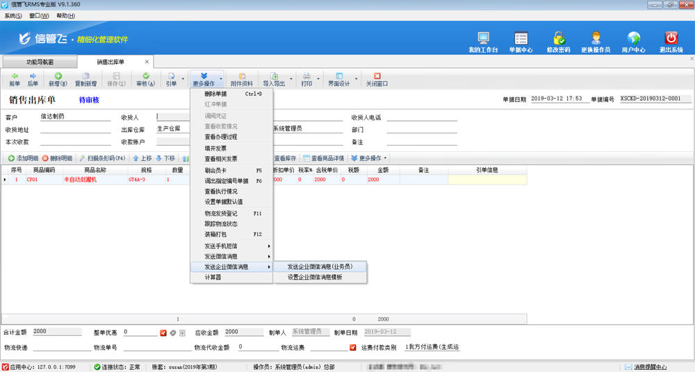 微信消息參數(shù)設(shè)置完成后,新開一個業(yè)務(wù)單據(jù),錄入單據(jù)信息后點擊保存按鈕,然后在工具欄“更多操作”下選擇“發(fā)送企業(yè)微信消息”。系統(tǒng)會根據(jù)消息模板自動生成消息內(nèi)容,點擊“確認發(fā)送”會發(fā)送一條消息。