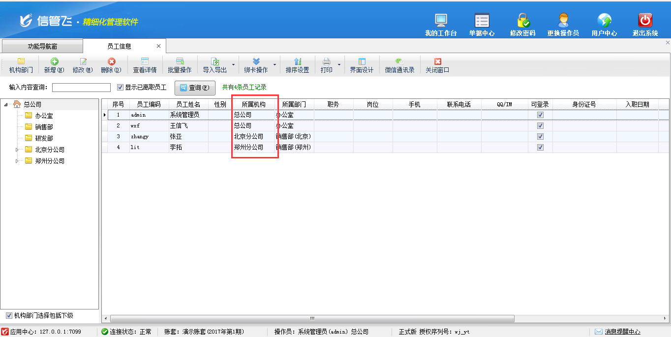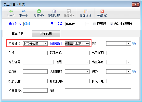 員工信息維護(hù),可設(shè)置員工所屬分支機(jī)構(gòu)。