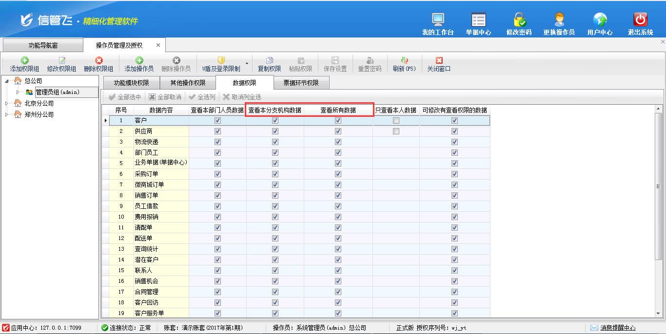分支機(jī)構(gòu)操作員權(quán)限設(shè)置,可設(shè)置分支機(jī)構(gòu)操作員只查看本分支機(jī)構(gòu)數(shù)據(jù),也可設(shè)置查看所有數(shù)據(jù)(所有數(shù)據(jù)包括總公司及所有分支機(jī)構(gòu)的數(shù)據(jù))。