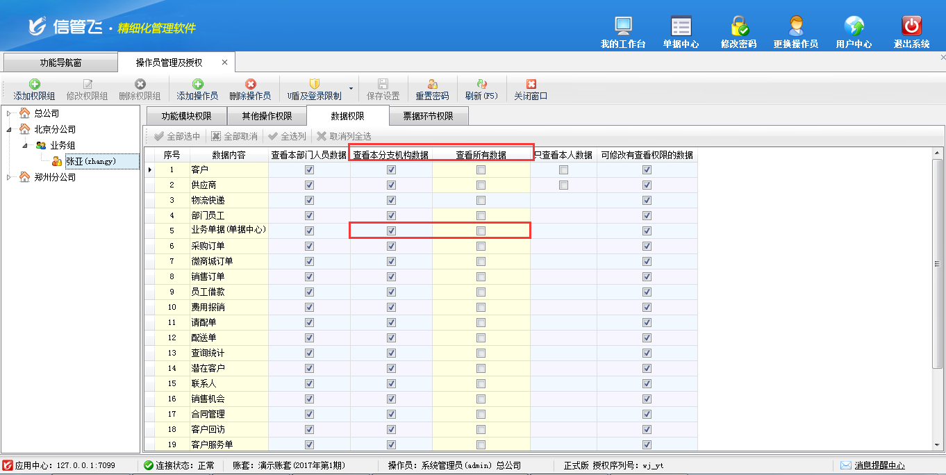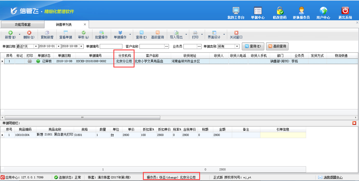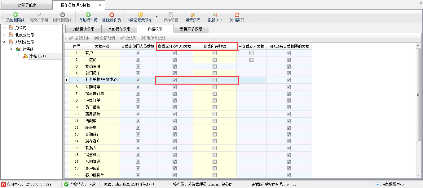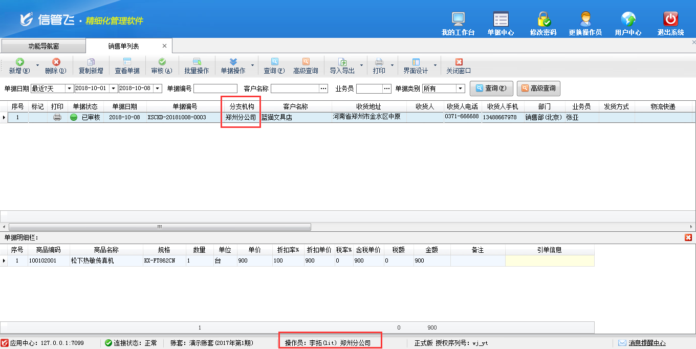 分支機(jī)構(gòu)(鄭州分公司)操作員李拓:只能查看鄭州分公司的銷售單