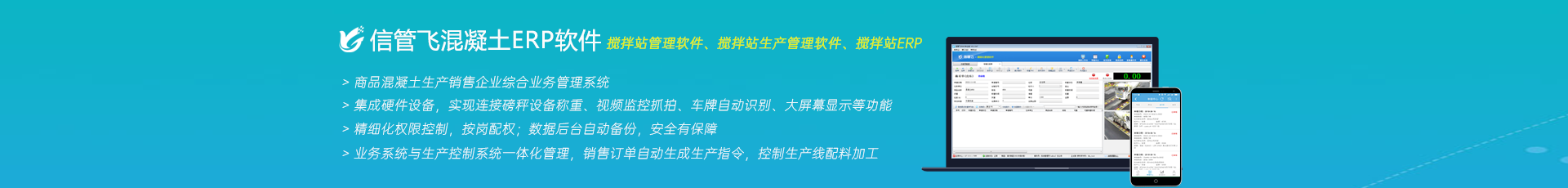 信管飛混凝土ERP(攪拌站ERP管理軟件、商品混凝土管理系統、商砼ERP)是混凝土生產銷售企業開發的綜合業務管理平臺,實現混凝土攪拌站采、銷、產、檢、送等業務一體化管理,包括業務管理系統、生產控制管理系統、無人值守稱重系統、物流車輛管理系統、實驗室管理系統、移動應用平臺等子系統,集成配套地磅、車輛GPS、RFID、視頻監控設備、工業串口服務器、LED大屏等硬件設備,并進行智能化互聯,為混凝土企業提供集成化的一站式應用平臺,是混凝土攪拌站首選管理系統!