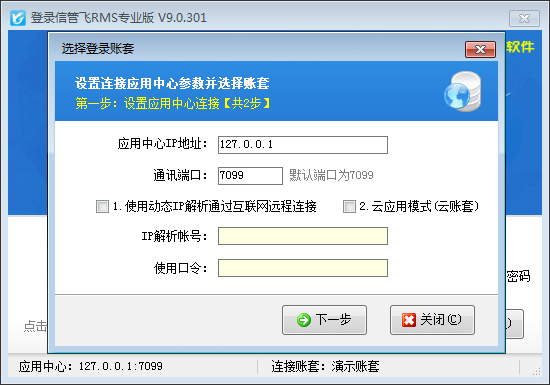 (2)互聯(lián)網(wǎng)遠(yuǎn)程使用:如果是通過互聯(lián)網(wǎng)遠(yuǎn)程連接(比如異地使用),軟件支持動態(tài)IP解析服務(wù)和云應(yīng)用(云賬套)兩種方式(均為增值服務(wù),需按年付費(fèi))。購買后輸入我們提供的IP解析帳號、使用口令或通行證帳號、密碼,然后點(diǎn)“下一步”按鈕,選擇要登錄的賬套。