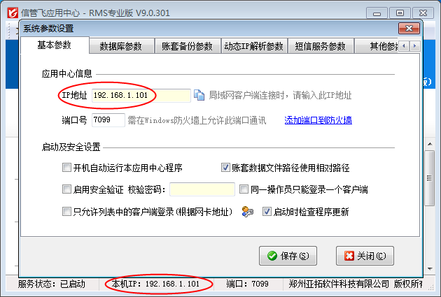 ????(1)應(yīng)用中心IP地址即主機(jī)電腦的IP地址,可以在主機(jī)上的應(yīng)用中心程序上查看(在狀態(tài)欄和系統(tǒng)參數(shù)設(shè)置中都可以看到),如下圖所示: