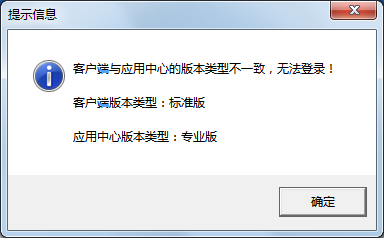 ????(3)如果登錄的時候提示如下信息,則表明客戶端程序的版本類型與主機(jī)電腦上的應(yīng)用中心程序的版本類型不一致,請使用相同版本類型的程序登錄即可。