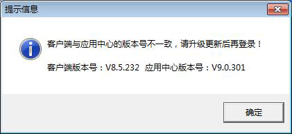 ????(4)客戶端程序登錄的時候,如果發(fā)現(xiàn)與主機(jī)電腦上的應(yīng)用中心程序版本號不一致,會提示如下信息,用相同版本的安裝程序安裝一下即可。