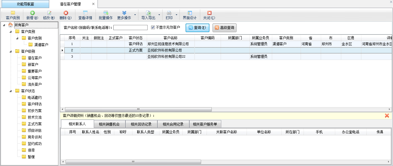 ????在左側導航樹中可以按照客戶類別、客戶級別、客戶狀態進行分類,點擊后可以顯示相應類別的潛在客戶資料。在右側點擊潛在客戶記錄后,下方會顯示與該潛在客戶有關的聯系人、銷售機會記錄、回訪記錄、合同記錄、客戶服務單記錄等信息(為了加快數據顯示速度,默認只顯示最近 10 條記錄)。