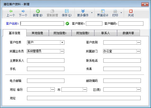 新增潛在客戶:點工具欄中的“新增”按鈕,可以增加新的潛在客戶資料。新增加客戶資料如下圖所示。