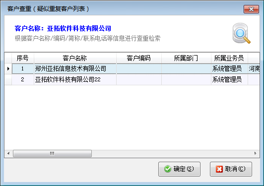 ????(4)在潛在客戶資料錄入時,由于潛在客戶的來源比較多,信息一般未經核實或確認,最經常出現的問題,就是客戶資料錄入重復。軟件提供客戶查重功能,可根據客戶名稱/簡稱/聯系電話/手機等條件進行信息檢查。點“更多操作”—》“客戶名稱查重”可以檢測是否有疑似重復的潛在客戶資料。如下圖所示: