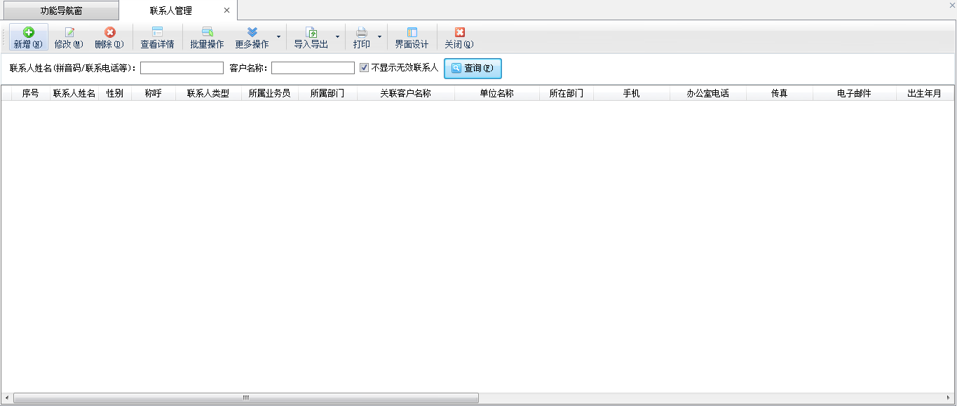????在功能導航窗,點“客戶關系”—》“聯系人”,即可進入聯系人管理界面,如下圖所示:
