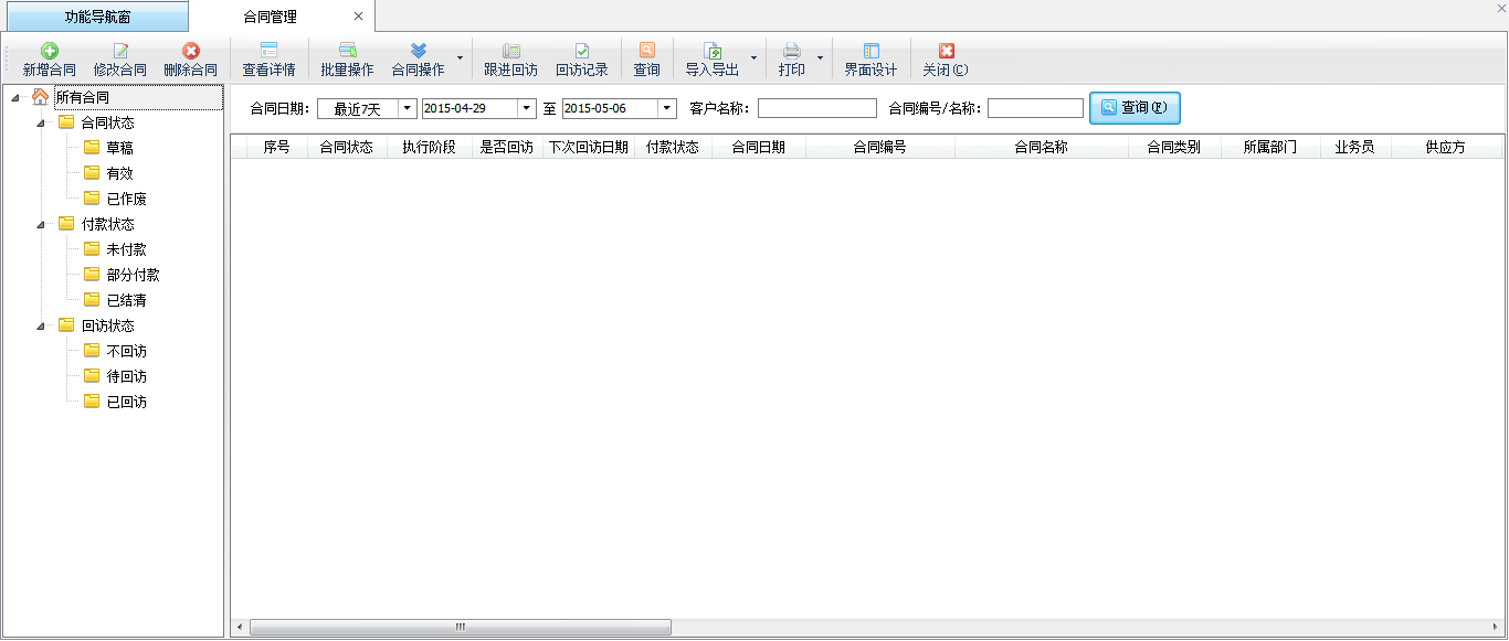 ????在左側導航樹中可以按照合同狀態、付款狀態、回訪狀態等進行分類查詢,點擊后可以顯示相應分類下的合同信息。
