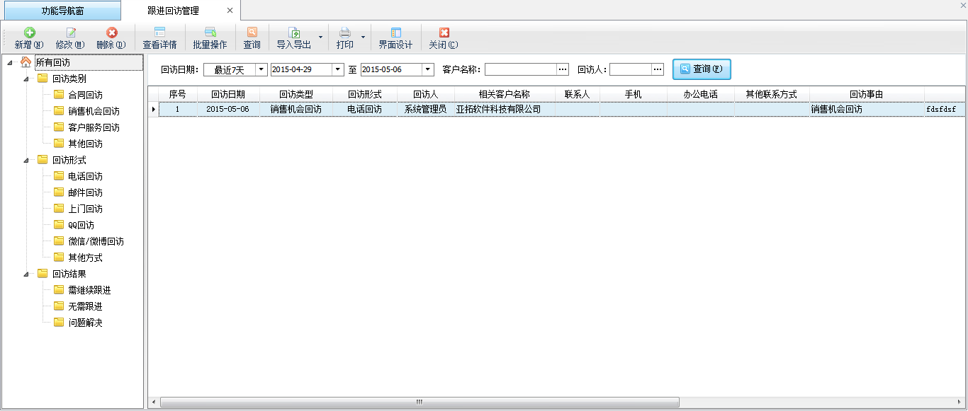 ????點擊界面左側導航樹中的回訪類別、回訪形式、回訪結果等分類條件,可以查詢相應的回訪記錄。
