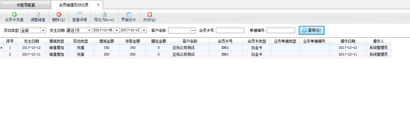 ????會員儲值管理功能可以對儲值卡的會員儲值變動情況進行管理,在功能導航窗點擊“會員管理”—》“會員儲值管理”可以打開會員儲值變動記錄界面,其界面如下圖所示。