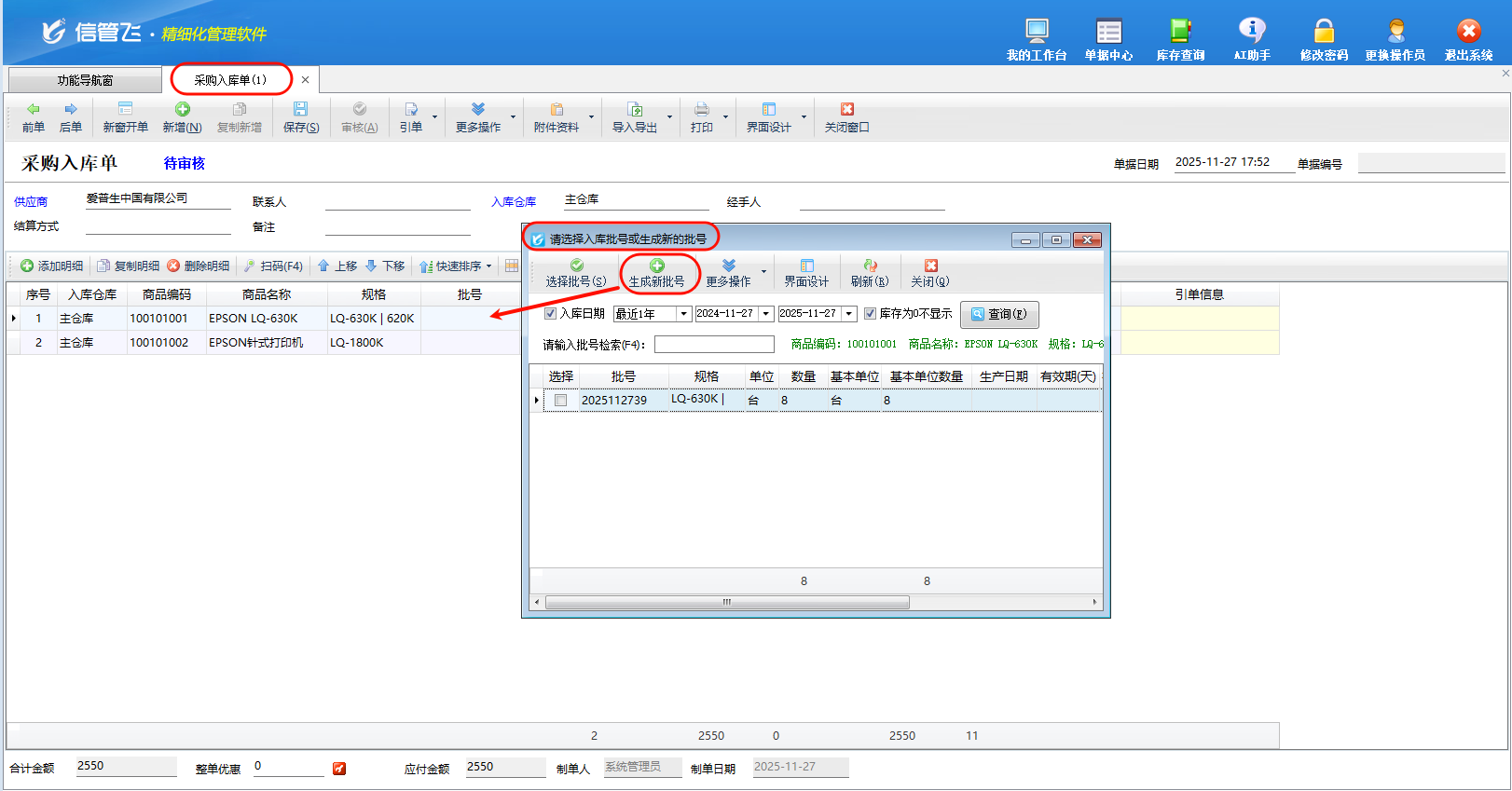 ????以采購入庫單為例:在功能導航窗點“采購管理”,點擊“采購入庫單”即可進入“采購入庫單”界面,點擊“添加明細”選擇商品明細后,可在批號中手動輸入批號或點擊批號彈出選擇批號和生成新批號界面,點擊“生成新批號”,會自動生成新的批號,如下圖所示: