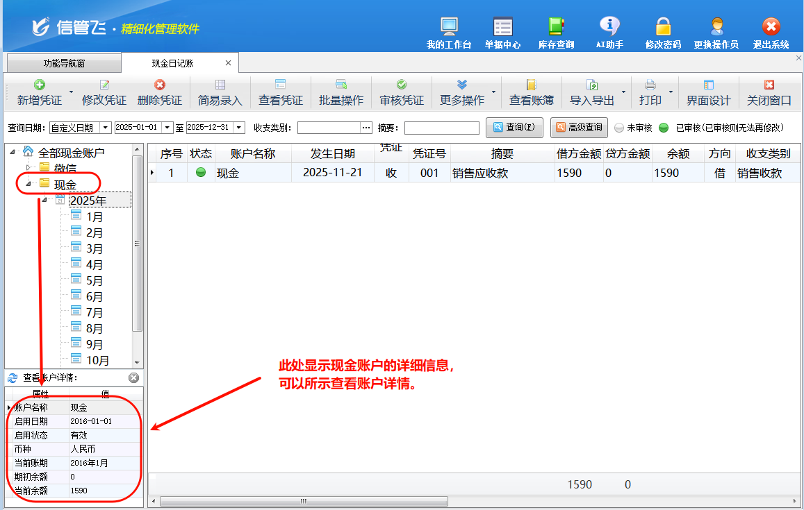 | 4 | 查看現金點驗單 | 選擇一條現金點驗記錄,然后點擊工具欄中的“查看詳情”按鈕,系統會彈出“查看現金點驗單”界面,可以查看點驗單的詳細信息。 |