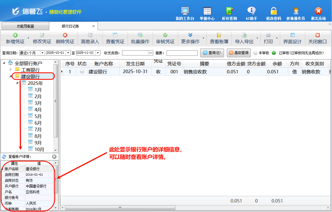 | 4 | 查看銀行對賬單 | 選擇一條銀行對賬記錄,然后點擊工具欄中的“查看詳情”按鈕,系統會彈出“查看銀行對賬單”界面,可以查看銀行對賬單的詳細信息。 |