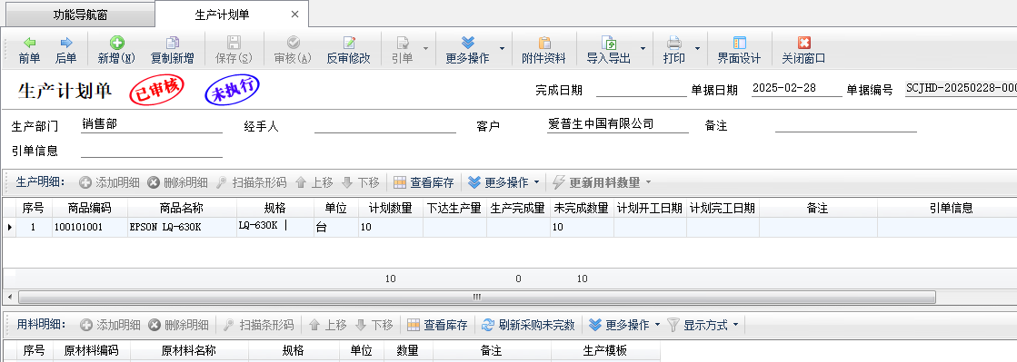 ????(1)未執(zhí)行:新增加的生產(chǎn)計(jì)劃單,處于“未執(zhí)行”狀態(tài)。