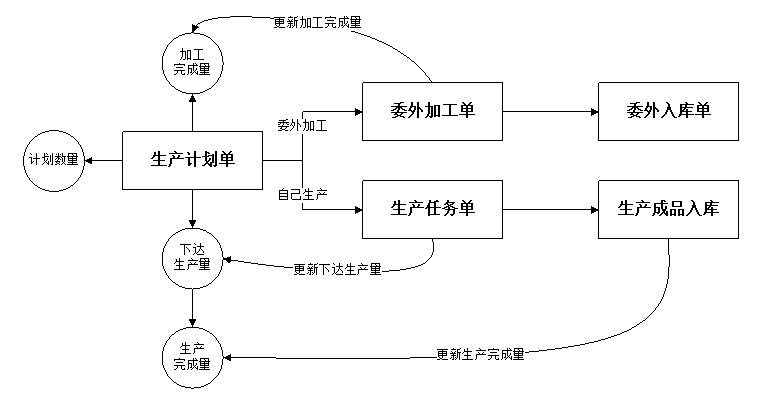 ????② 生產(chǎn)計(jì)劃明細(xì)中只能輸入計(jì)劃數(shù)量(即計(jì)劃生產(chǎn)數(shù)量),其他數(shù)量由后續(xù)單據(jù)執(zhí)行后自動更新。下圖為不同業(yè)務(wù)單據(jù)更新相應(yīng)數(shù)量示意圖:
