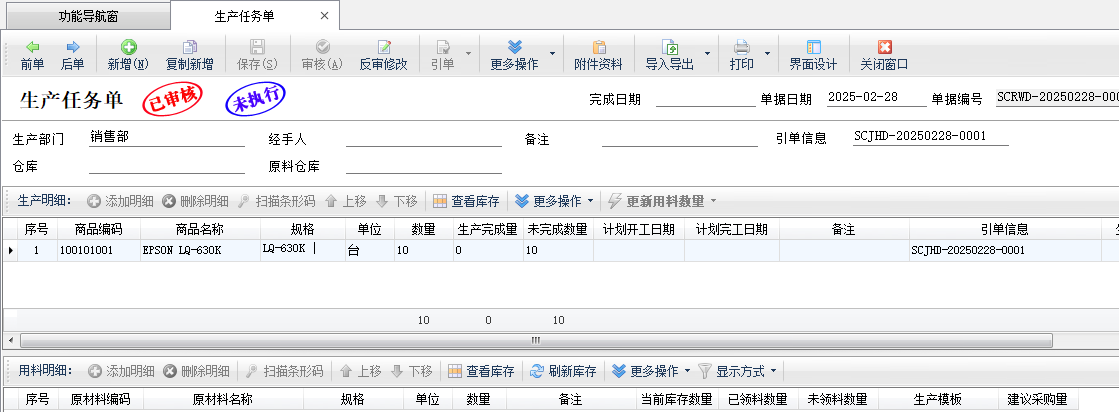 單據(jù)明細(xì):引用或輸入生產(chǎn)商品明細(xì)后,只需要錄入“數(shù)量”,其他數(shù)量由后續(xù)業(yè)務(wù)單據(jù)引用生成任務(wù)單后,自動更新。