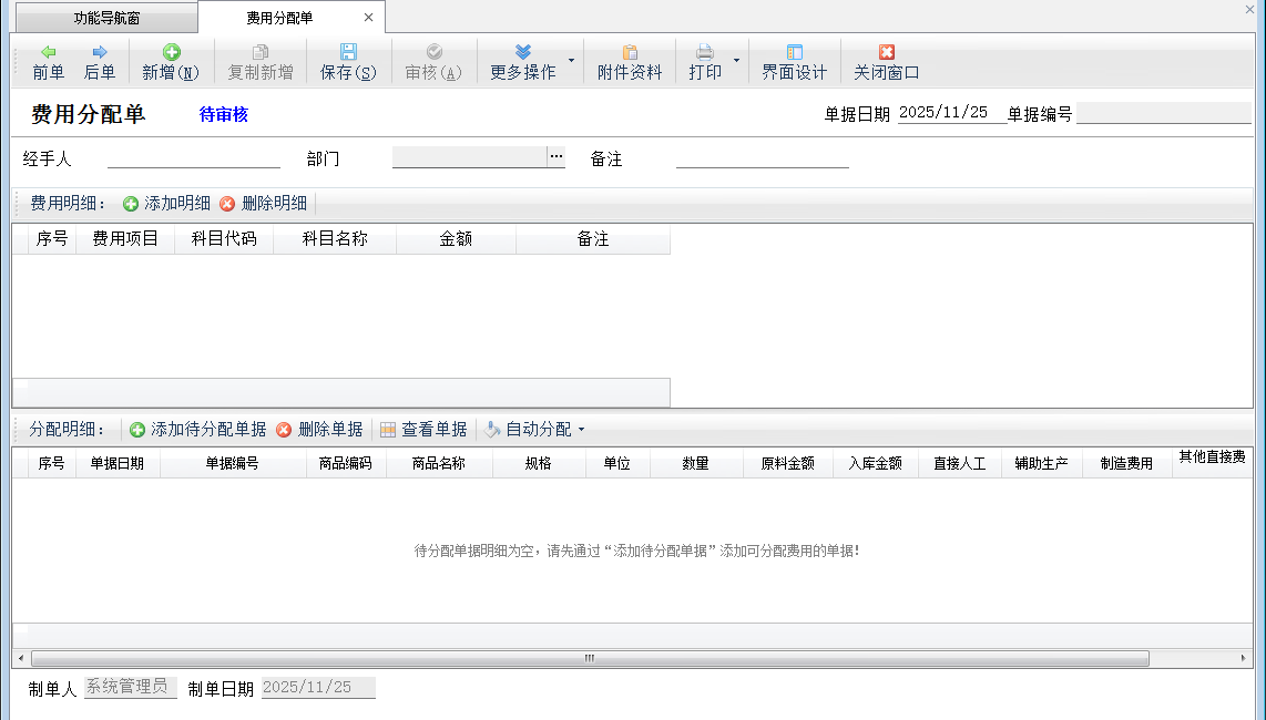 ????在功能導(dǎo)航窗,點(diǎn)“生產(chǎn)管理”—》“費(fèi)用分配單”,即可進(jìn)入費(fèi)用分配單界面,如下圖所示: