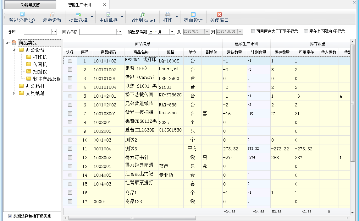 ????智能生產(chǎn)計(jì)劃可根據(jù)當(dāng)前庫存情況,并可結(jié)合庫存上下限、往年同期銷售量、銷售訂單數(shù)量、待審核數(shù)量等條件進(jìn)行組合運(yùn)算,從而給出建議的商品生產(chǎn)建議數(shù)量,并可以把建議結(jié)果生成為生產(chǎn)計(jì)劃單。