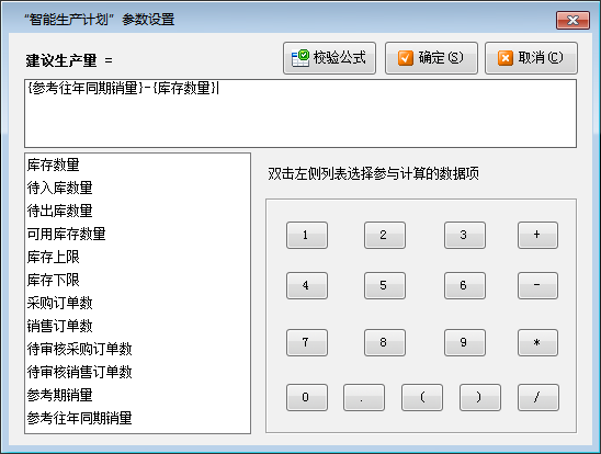 (1)參數(shù)設(shè)置:可以設(shè)置“建議生產(chǎn)量”的運(yùn)算公式,軟件將根據(jù)您設(shè)計(jì)的公式計(jì)算出建議數(shù)量。