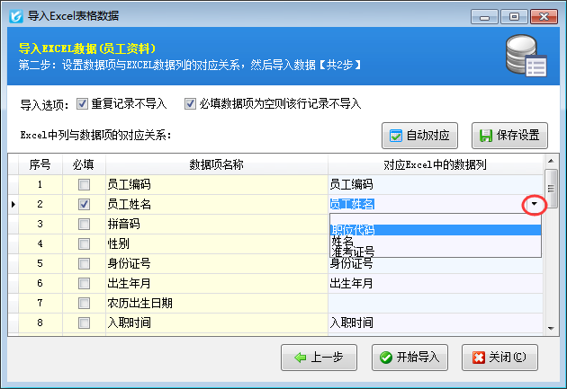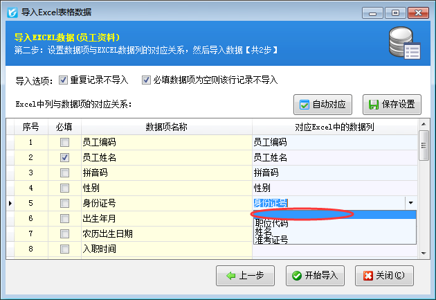 配置數(shù)據(jù)項與Excel中數(shù)據(jù)列的對應關系:點“下一步”按鈕配置“數(shù)據(jù)項”與Excel中的數(shù)據(jù)列之間的對應關系。點“自動對應”軟件會自動根據(jù)數(shù)據(jù)項名稱和數(shù)據(jù)列列名是否相同進行自動匹配。也可以按照下圖所示手工選擇對應關系。
