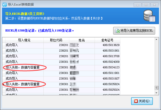 ????導入過程中軟件會實時顯示導入進度,如果數(shù)據(jù)量比較大時,導入進度達到100%時軟件進行數(shù)據(jù)提交會比較耗時。導入結束后,軟件會顯示導入的結果。沒有導入的記錄軟件會給出相應的原因,如下圖所示:
