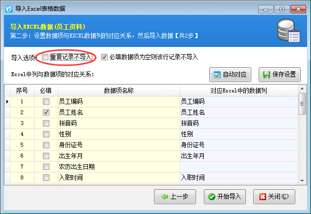 導入失敗,數(shù)據(jù)內容重復:這種情況是因為軟件根據(jù)條件判斷相應的記錄在數(shù)據(jù)庫中已存在(一般根據(jù)名稱,如商品名稱、姓名、客戶名稱、供應商名稱等),如果確實需要導入,可以取消下圖中的選項,重新導入: