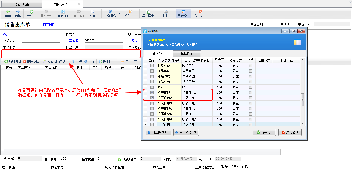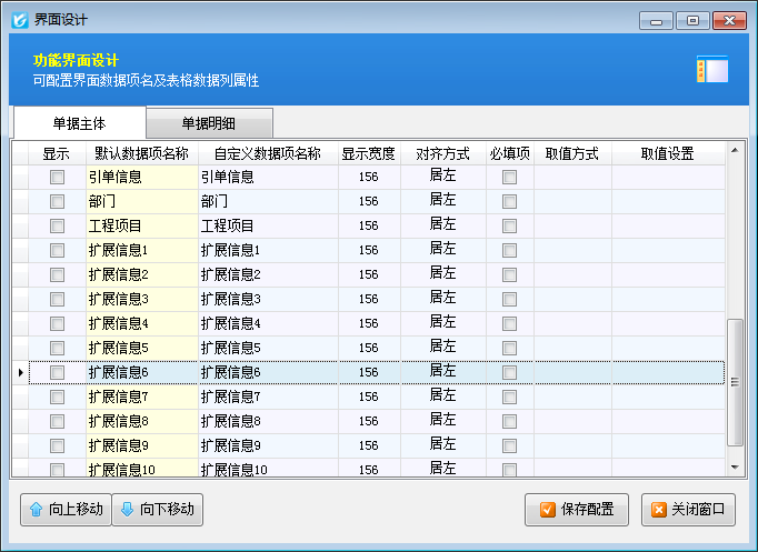 ????“單據(jù)主體”中如果打勾設(shè)置顯示數(shù)據(jù)項,但在界面上看不到,這是因為這個數(shù)據(jù)項目上方還有多個不顯示的數(shù)據(jù)項,遇到這種情況將相應(yīng)的數(shù)據(jù)項向上移動,與其他需要顯示的數(shù)據(jù)項移動到一起,然后“保存配置”按鈕即可。如下圖所示,可以將“擴(kuò)展信息 1”和“擴(kuò)展信息 2”移動到上面即可: