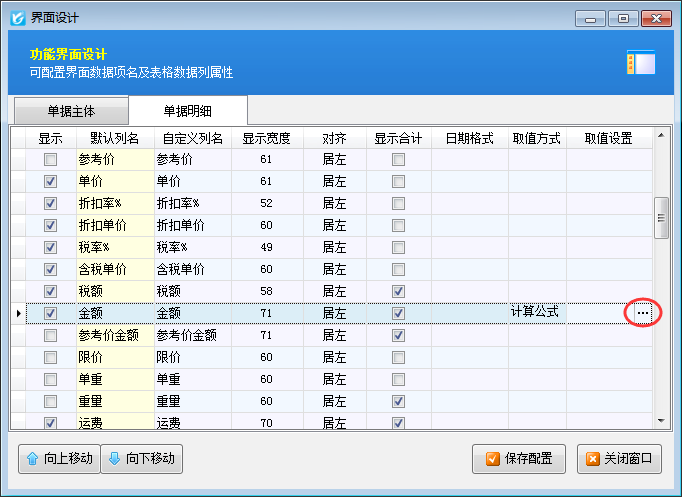 ????“單據(jù)明細(xì)”中的數(shù)據(jù)項,如果是日期類型,可以配置日期的顯示格式;部分?jǐn)?shù)據(jù)項還可以設(shè)置從“基礎(chǔ)資料”或“數(shù)據(jù)字典”中獲取數(shù)值;數(shù)量、單價、金額這三個數(shù)據(jù)項還支持設(shè)置從計算公式中取值。
