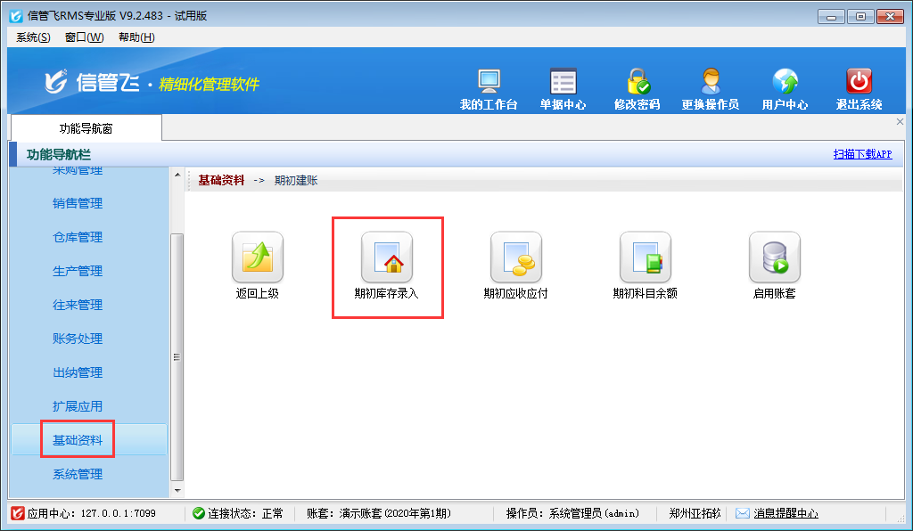 ????登錄信管飛RMS,在功能導(dǎo)航窗,點(diǎn)“基礎(chǔ)資料”—》“期初建賬”,然后點(diǎn)擊“期初庫存錄入”,進(jìn)入“期初庫存單”可錄入期初商品庫存(有期初庫存的倉庫和商品,需要提前在“基礎(chǔ)資料”錄入“倉庫信息”、“商品信息”)。“期初庫存單”上面填寫商品庫存數(shù)量、成本單價(jià)等信息后點(diǎn)擊“保存”按鈕。如圖下圖所示: