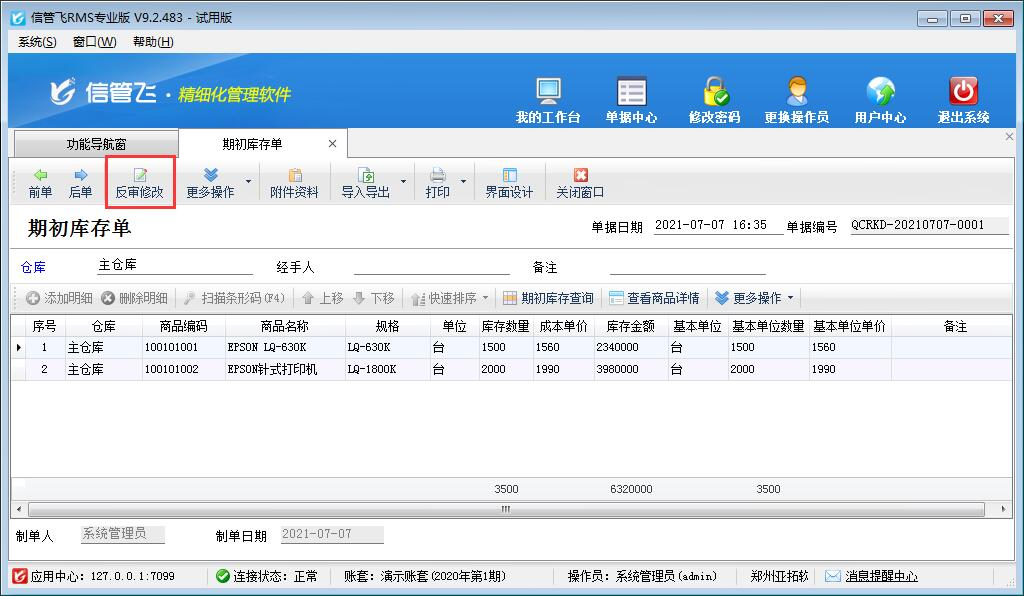 ????③開賬后,如果期初數(shù)量發(fā)現(xiàn)有錯(cuò)誤,可以點(diǎn)“其他入庫單”或“其他出庫單”(“倉庫管理”功能分組中)調(diào)整庫存數(shù)量。如果發(fā)現(xiàn)成本單價(jià)有錯(cuò)誤,可以開“成本調(diào)整單”調(diào)整成本價(jià)。另外,開帳后,如果發(fā)現(xiàn)期初庫存數(shù)量或成本單價(jià)有錯(cuò)誤,也可以對(duì)“期初庫存單”進(jìn)行反審修改,如下圖所示,點(diǎn)擊“反審修改”按鈕后修改單據(jù)信息,修改后保存單據(jù)即可。