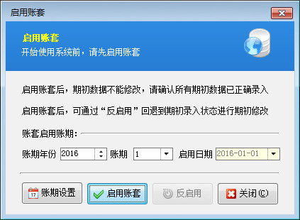 ????啟用賬期:是指準(zhǔn)備從哪個(gè)月份開始使用軟件(舉例:假設(shè)當(dāng)前月份為2016年4月份,但我們想從2016年2月份開始使用軟件,可以將啟用賬期設(shè)置為2016年、賬期為2,這樣我們需要整理的期初數(shù)據(jù)就應(yīng)該是截止到2016-02-01前的期初應(yīng)收應(yīng)付款、期初商品庫存,開賬后就可以錄入2016-02-01之后的業(yè)務(wù)單據(jù))。