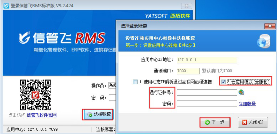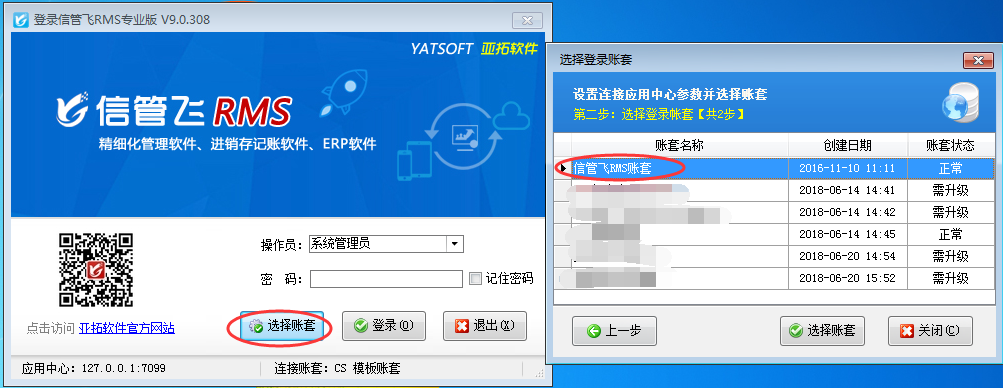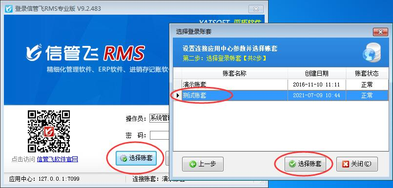 ????運(yùn)行信管飛RMS客戶(hù)端(藍(lán)色圖標(biāo)),在軟件登錄界面點(diǎn)擊“選擇賬套”,在“選擇登錄賬套”界面選擇我們所需要的賬套,然后登錄軟件即可。