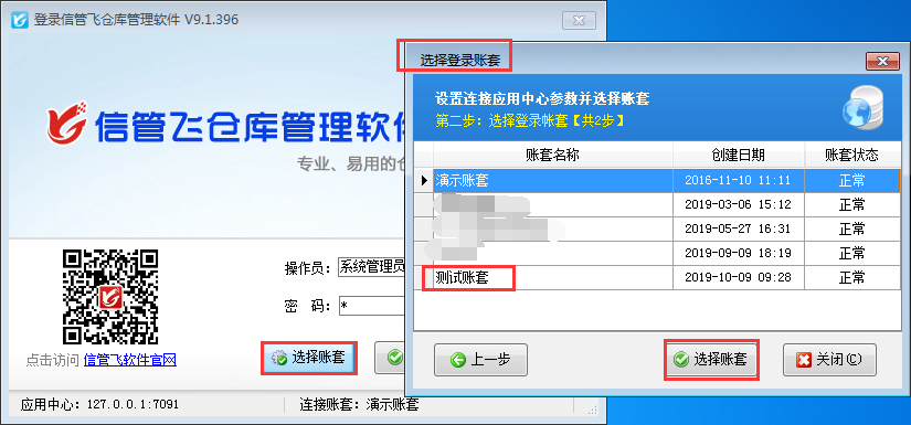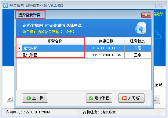 ????從新打開(kāi)應(yīng)用中心后,電腦右下角會(huì)顯示應(yīng)用中心圖標(biāo)。然后打開(kāi)客戶(hù)端程序(藍(lán)色圖標(biāo)),登錄界面點(diǎn)擊“選擇帳套”,然后下一步,然后會(huì)出現(xiàn)選擇登錄帳套窗口,此時(shí)顯示的可登錄的帳套列表。剛才已停用的“信管飛帳套”已不在列表內(nèi),無(wú)法選擇到了,如圖所示。