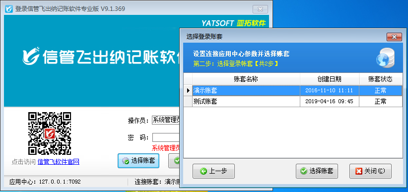 ????重新運(yùn)行應(yīng)用中心后,電腦右下角會(huì)顯示應(yīng)用中心圖標(biāo)。然后打開(kāi)客戶(hù)端程序(藍(lán)色圖標(biāo)),登錄界面點(diǎn)擊“選擇帳套”,然后下一步,然后會(huì)出現(xiàn)“選擇登錄帳套”窗口,此時(shí)顯示的可登錄的帳套列表。剛才已停用的“演示賬套0306”已不在列表內(nèi),無(wú)法選擇到了,如下圖所示。
