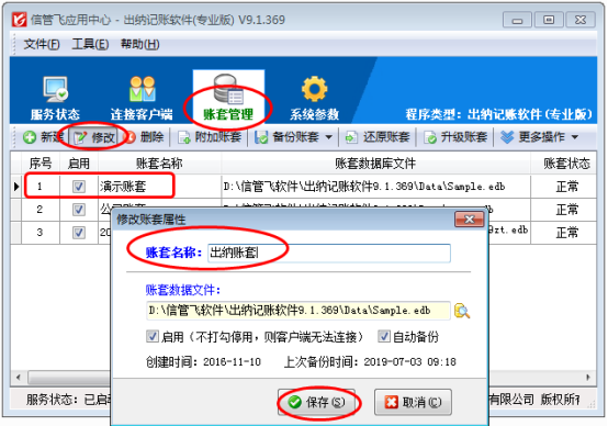 ????以“信管飛出納記賬軟件”為例,示范下如何修改賬套的名稱(chēng)。打開(kāi)紅色的應(yīng)用中心程序(應(yīng)用中心運(yùn)行后桌面右下角會(huì)顯示相應(yīng)的圖標(biāo),點(diǎn)擊即可打開(kāi)應(yīng)用中心主界面),在賬套管理界面,點(diǎn)擊賬套后選擇工具欄中的“修改”按鈕,彈出“修改賬套屬性”界面,把“演示賬套”修改為“出納賬套”,然后點(diǎn)擊“保存”按鈕,如下圖所示: