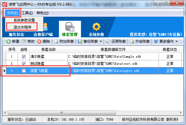 ????亞拓軟件旗下的信管飛RMS、信管飛倉(cāng)庫(kù)管理軟件、信管飛送貨單軟件、信管飛出納記賬軟件、信管飛票據(jù)打印軟件等新架構(gòu)程序軟件安裝后會(huì)顯示兩個(gè)圖標(biāo),一個(gè)是應(yīng)用中心程序(紅色圖標(biāo)),一個(gè)是客戶(hù)端程序(藍(lán)色圖標(biāo))。這些軟件都含有賬套管理功能,在應(yīng)用中心里面可以建立多個(gè)賬套,已使用的帳套如果不再繼續(xù)使用,可以停用帳套,停用帳套后,客戶(hù)端程序登錄時(shí)無(wú)法連接該帳套。我們以信管飛RMS為例演示一下如何停用帳套。