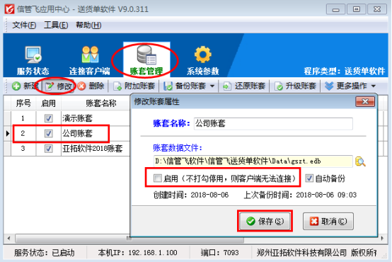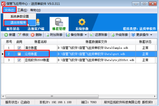 ????亞拓軟件旗下的信管飛RMS、信管飛倉(cāng)庫(kù)管理軟件、信管飛送貨單軟件、信管飛出納記賬軟件、信管飛票據(jù)打印軟件等軟件程序安裝后會(huì)顯示兩個(gè)圖標(biāo),一個(gè)是應(yīng)用中心程序(紅色圖標(biāo)),一個(gè)是客戶(hù)端程序(藍(lán)色圖標(biāo))。這些軟件都含有賬套管理功能,在應(yīng)用中心里面可以建立多個(gè)賬套,已使用的帳套如果不再繼續(xù)使用,可以停用帳套,停用帳套后,客戶(hù)端程序登錄時(shí)無(wú)法連接該帳套。我們以信管飛送貨單軟件為例演示一下如何停用帳套。