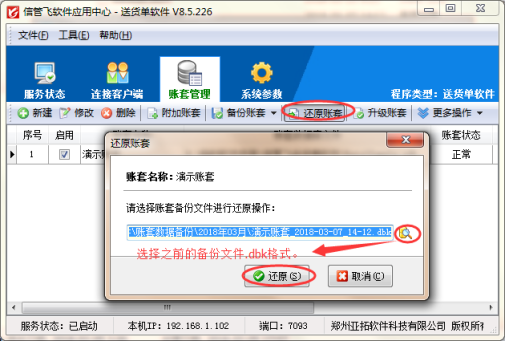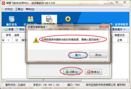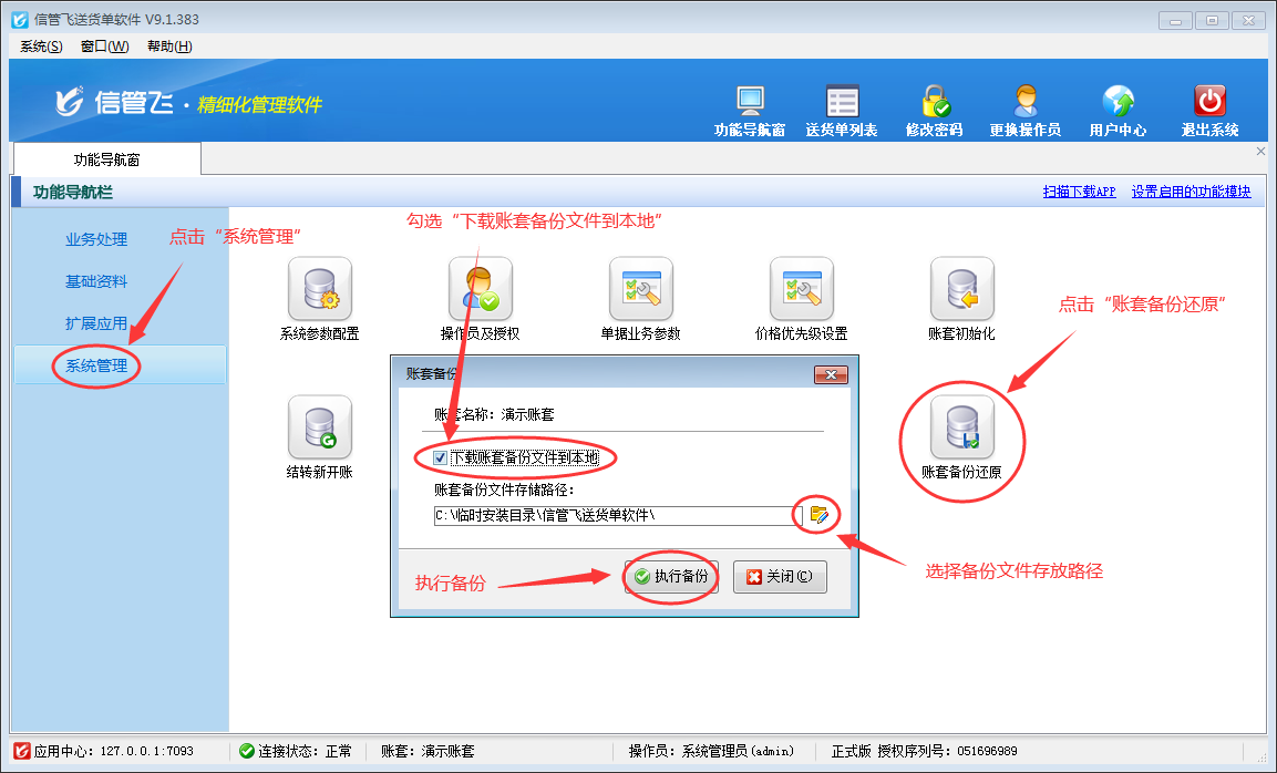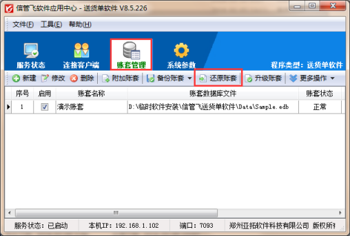 ????信管飛RMS、信管飛送貨單軟件、信管飛出納記賬軟件、信管飛倉(cāng)庫(kù)管理軟件等都支持免費(fèi)下載安裝試用。試用版本中會(huì)存在一個(gè)演示賬套。演示賬套中有演示數(shù)據(jù),方便試用軟件功能(賬套即賬套數(shù)據(jù)庫(kù),這是一個(gè)會(huì)計(jì)業(yè)務(wù)引申出來(lái)的概念,賬套數(shù)據(jù)庫(kù)中存儲(chǔ)業(yè)務(wù)數(shù)據(jù))。如后續(xù)購(gòu)買(mǎi)為正式版本,可以繼續(xù)使用演示賬套。為了區(qū)分賬套數(shù)據(jù),軟件支持修改賬套的名稱(chēng)。