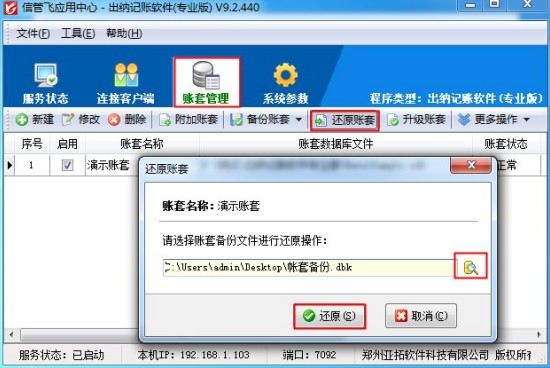 ????賬套即賬套數(shù)據(jù)庫(kù),這是一個(gè)會(huì)計(jì)業(yè)務(wù)引申出來(lái)的概念,賬套數(shù)據(jù)庫(kù)中存儲(chǔ)業(yè)務(wù)數(shù)據(jù)。使用軟件之前建議新增加一個(gè)賬套,用于重新錄入和管理數(shù)據(jù),信管飛RMS、信管飛倉(cāng)庫(kù)管理軟件、信管飛送貨單軟件、信管飛出納記賬軟件、信管飛票據(jù)打印軟件等軟件的賬套都是在主機(jī)電腦的應(yīng)用中心程序上集中管理的,下面我們以信管飛出納記賬軟件為例詳細(xì)介紹下在使用軟件之前如何新增加一個(gè)賬套?