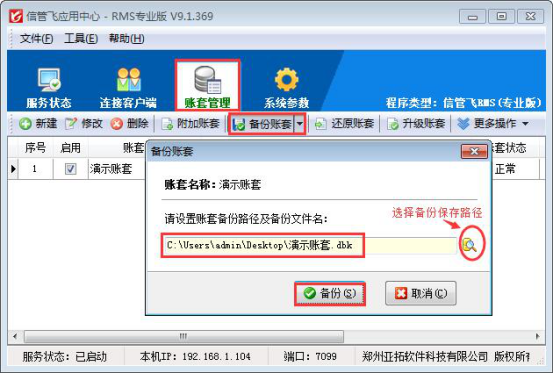 ????打開(kāi)“信管飛RMS應(yīng)用中心”,在應(yīng)用中心主界面中點(diǎn)擊“賬套管理”進(jìn)入賬套管理界面,選中我們需要備份的賬套,點(diǎn)擊“備份賬套”按鈕,可以彈出備份賬套的對(duì)話框,在此我們可以設(shè)置備份出來(lái)的賬套備份文件存放路徑實(shí)現(xiàn)對(duì)賬套的備份操作,如下圖所示。