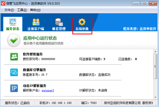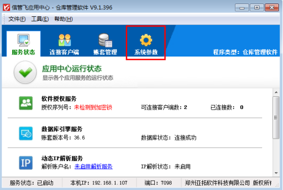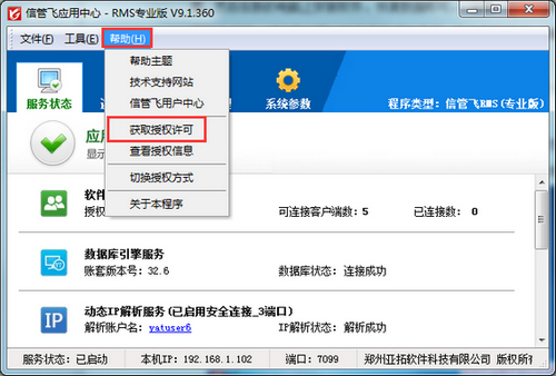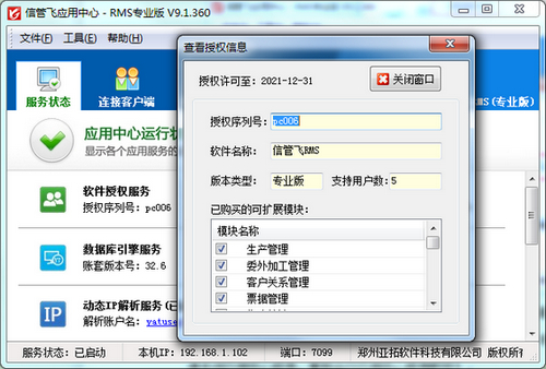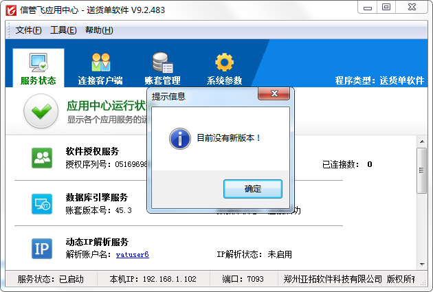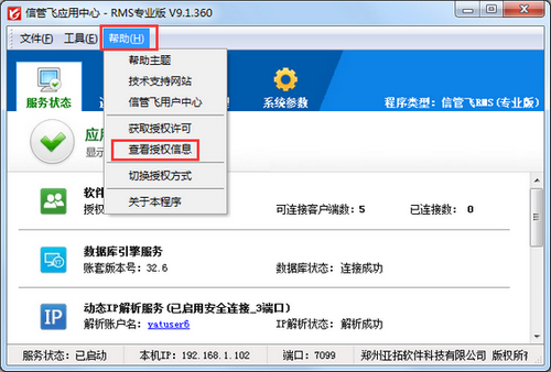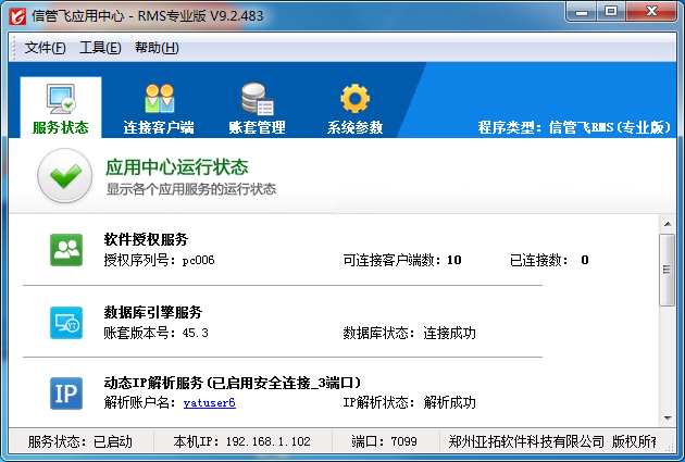 ????信管飛RMS、信管飛倉(cāng)庫(kù)管理軟件、信管飛出納記賬軟件、信管飛送貨單軟件和信管飛票據(jù)打印軟件都由客戶(hù)端程序和應(yīng)用中心程序兩部分組成,應(yīng)用中心可以全面掌控軟件的運(yùn)行情況,可以隨時(shí)查看各類(lèi)服務(wù)的運(yùn)行狀態(tài),主要包括軟件授權(quán)服務(wù)情況、數(shù)據(jù)庫(kù)引擎服務(wù)情況、動(dòng)態(tài)IP解析服務(wù)情況、手機(jī)短信服務(wù)情況等。下面我們以信管飛RMS專(zhuān)業(yè)版為例介紹一下應(yīng)用中心的服務(wù)狀態(tài)。