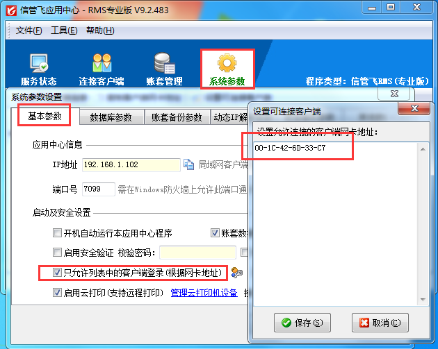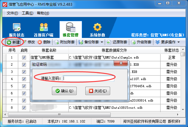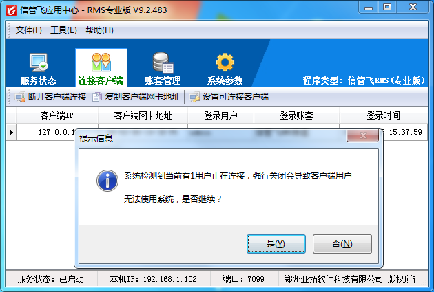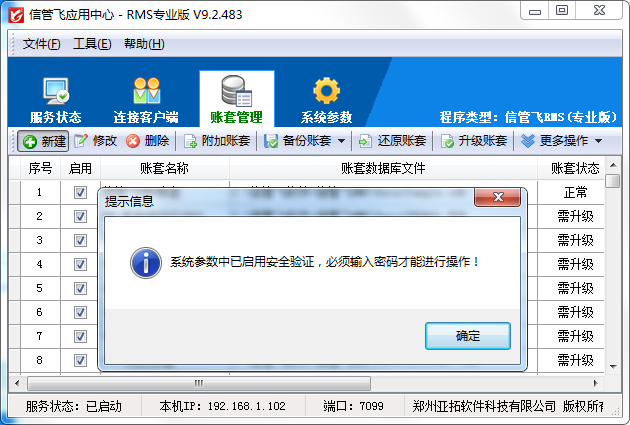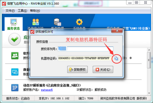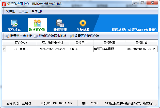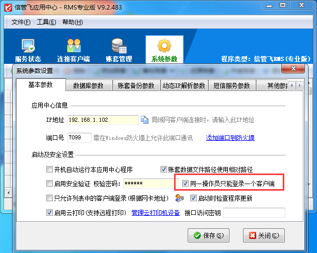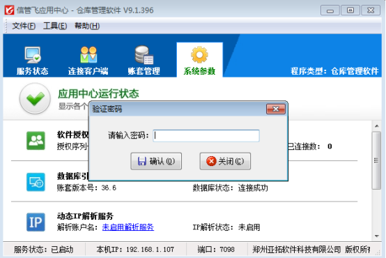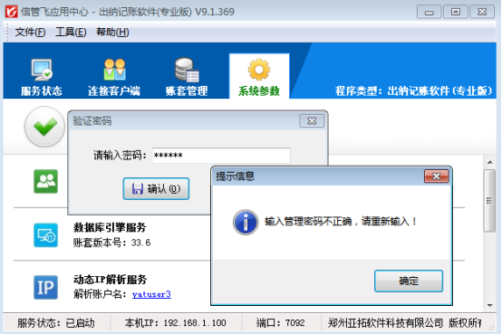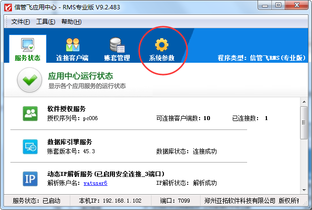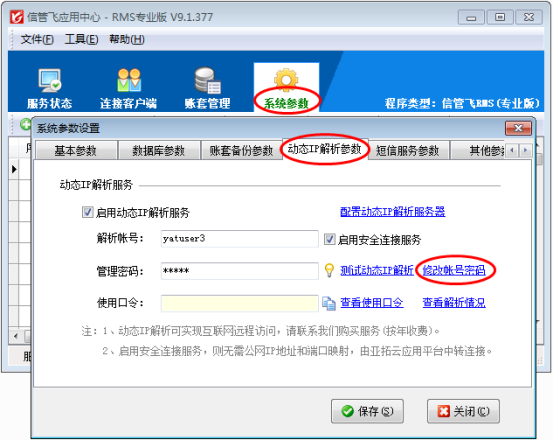 ????動(dòng)態(tài)IP解析服務(wù)是亞拓軟件開(kāi)發(fā)的基于互聯(lián)網(wǎng)的遠(yuǎn)程連接解決方案,采用專(zhuān)屬安全技術(shù),可以支持網(wǎng)絡(luò)版本在異地連接主機(jī)電腦進(jìn)行共享數(shù)據(jù)使用。動(dòng)態(tài)IP解析服務(wù)屬于增值服務(wù),使用需要另外進(jìn)行購(gòu)買(mǎi),購(gòu)買(mǎi)后會(huì)分配解析賬號(hào)、管理密碼和使用口令信息,管理密碼和使用口令可以自己修改。下面我們以信管飛RMS為例介紹一下如何修改動(dòng)態(tài)IP解析服務(wù)的管理密碼及使用口令。