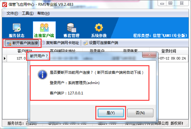 ????第一種解決方式:鼠標(biāo)雙擊軟件界面最下方的“連接狀態(tài):已斷開(kāi)”字樣,系統(tǒng)會(huì)彈出“系統(tǒng)與應(yīng)用中心的連接已斷開(kāi),是否嘗試重新連接?”提示信息,如圖所示,點(diǎn)“是”按鈕,客戶(hù)端程序會(huì)嘗試重新建立與應(yīng)用中心程序的連接。如果連接成功即可打開(kāi)相應(yīng)的功能,繼續(xù)使用軟件。