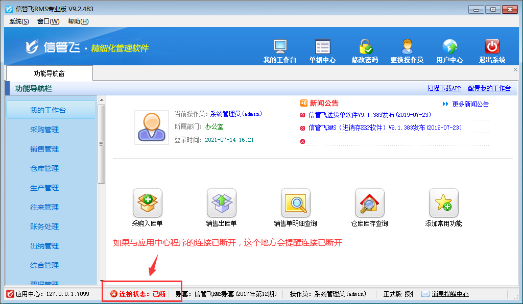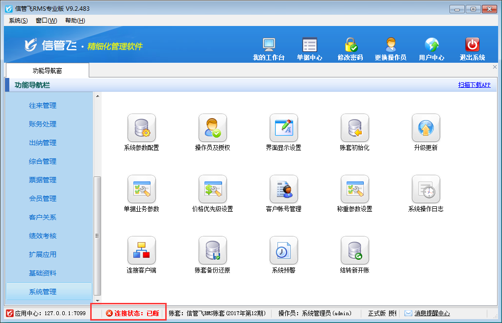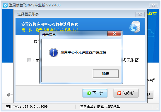 ????信管飛RMS、信管飛倉(cāng)庫(kù)管理軟件、信管飛出納記賬軟件、信管飛送貨單軟件、信管飛票據(jù)打印軟件都包括客戶(hù)端程序和應(yīng)用中心程序兩個(gè)模塊,客戶(hù)端程序登錄系統(tǒng)時(shí),應(yīng)用中心程序是必須打開(kāi)的。如果主機(jī)電腦(網(wǎng)絡(luò)版用戶(hù)插入加密鎖的電腦為主機(jī)電腦)關(guān)機(jī)或關(guān)閉應(yīng)用中心程序、程序出現(xiàn)異常等,客戶(hù)端程序與應(yīng)用中心的連接就會(huì)斷開(kāi)。應(yīng)用中心程序再次正常運(yùn)行后,客戶(hù)端程序需要重新建立與應(yīng)用中心程序的連接。下面我們以信管飛RMS專(zhuān)業(yè)版為例介紹一下客戶(hù)端程序重連應(yīng)用中心程序的操作。